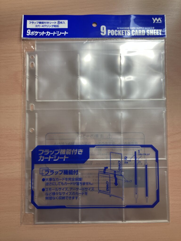大事なカードを確実に守る! 逆さにしてもカードが落ちないフラップ機能付き9ポケットカードシートです。3穴・4穴バインダー対応シート8枚入り。シートサイズ:226×292mm、ポケット内寸:約65×93mm